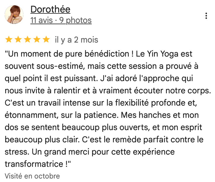 Curieuse, créative et hypersensible, je propose un yoga accessible et chaleureux, mêlant Yin et Nidra pour apaiser le corps et l’esprit, et Hatha Flow pour relancer l’énergie, dans un espace pour respirer et se recentrer.
